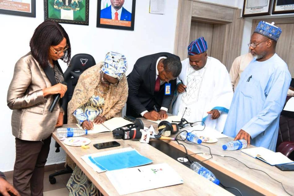 2nd left is the Permanent Secretary, Federal Ministry of Youth Development Dr.(Mrs) Maryam Keshinro while signing the MoUs with both Organisations in Abuja