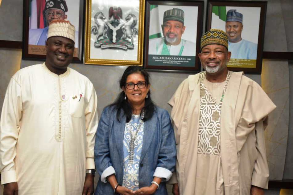 L-R, the Minister of State for Agriculture and Food Security, Sen Dr Aliyu Sabi Abdullahi, President, Heifer International, Surita Sandosham and Minister of Agriculture and Food Security, Sen Abubakar Kyari during the courtesy visit in Abuja.